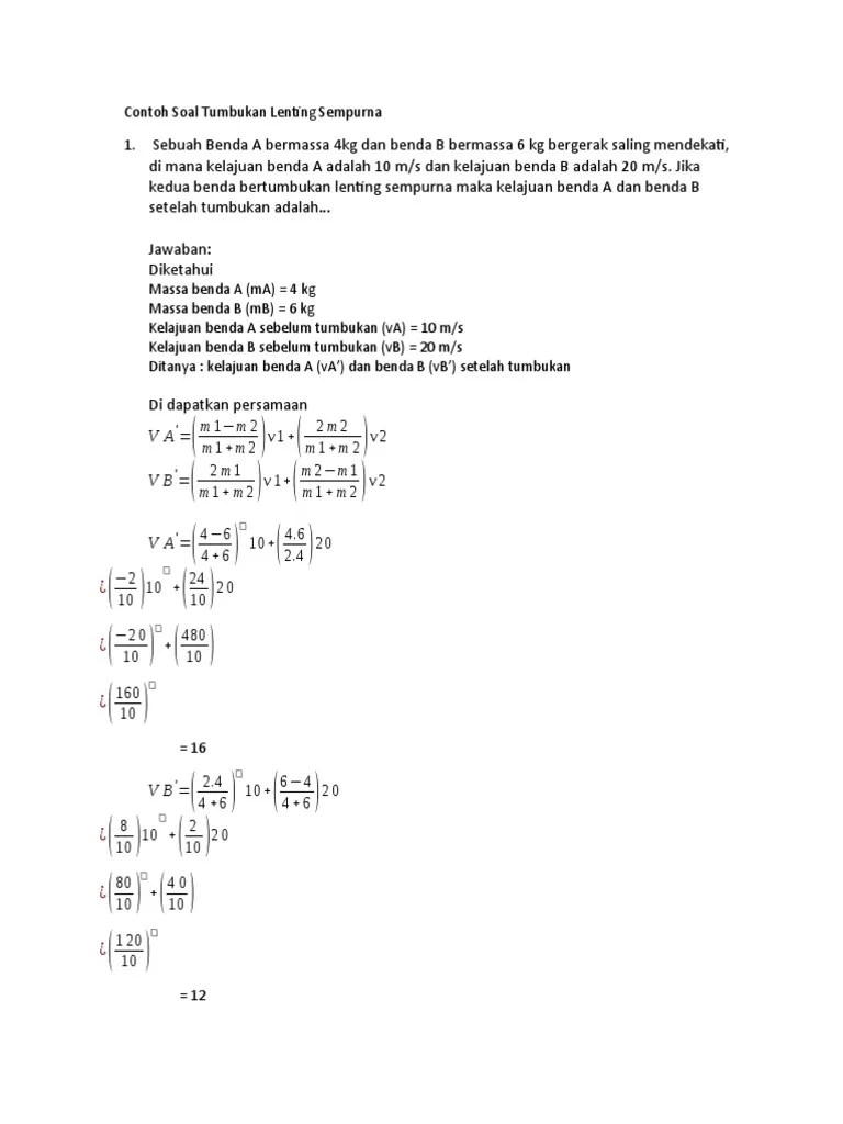 Koefisien restitusi dalam permasalahan contoh soal di atas termasuk ke dalam tumbukan lenting sebagian. Hukum kekekalan momentum linear menyatakan bahwa jika tidak ada gaya luar yang bekerja pada dua benda. Tentukan perbandingan massa kedua partikel jika. Sebuah peluru 20 g bergerak dengan kecepatan 50 m/s bersarang dalam balok 7 kg yang diam di atas . Jelaskan perbedaan tumbukan tidak lenting, tumbukan lenting sempurna dan tumbukan lenting sebagian beserta contoh dan kaitannya dengan. Benda a dan benda b bergerak . Pada tumbukan tidak lenting sama sekali berlaku hukum kekekalan . Secara umum, nilai koefisien elastisitas (e) dinyatakan dengan persamaan : Sebuah partikel mengalami tumbukan lenting sempurna dengan partikel lain yang diam. Tumbukan merupakan hasil interaktif dua buah benda yang bergerak searah atau berlawanan arah,. Gerak bola berlawanan dan bertumbukan. Pada tumbukan lenting sempurna berlaku. Tumbukan lenting sempurna tumbukan lenting sebagian tumbukan tumbukan tidak lenting sama sekali;